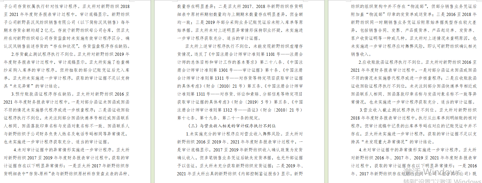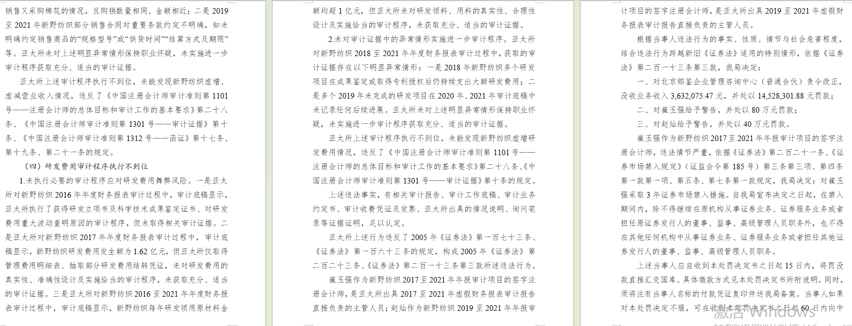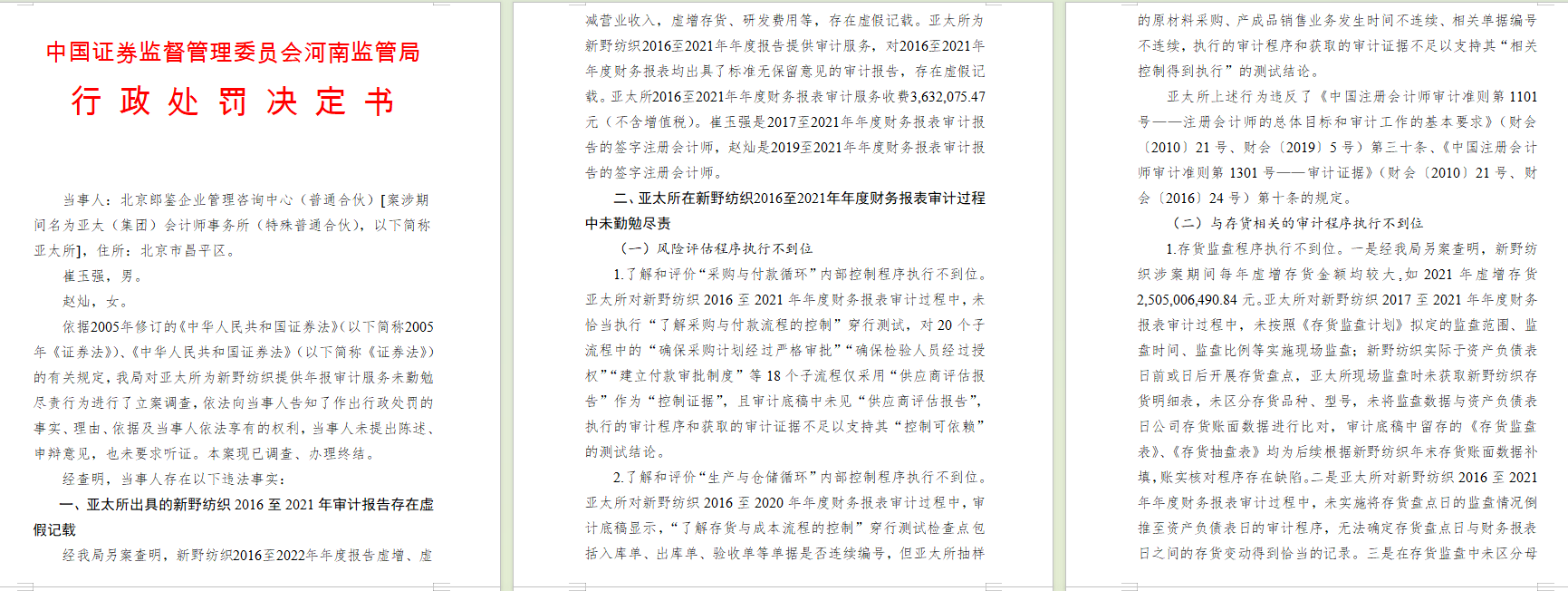 决定书显示,北京郎鉴企业管理咨询中心存在以下违法事实:亚太所出具的新野纺织2016至2021年审计报告存在虚假记载;亚太所在新野纺织2016至2021年年度财务报表审计过程中未勤勉尽责:风险评估程序、与存货相关的审计程序、与营业收入相关的审计程序、研发费用审计程序执行不到位。这些行为违反了《中国注册会计师审计准则》《证券法》的相关规定。