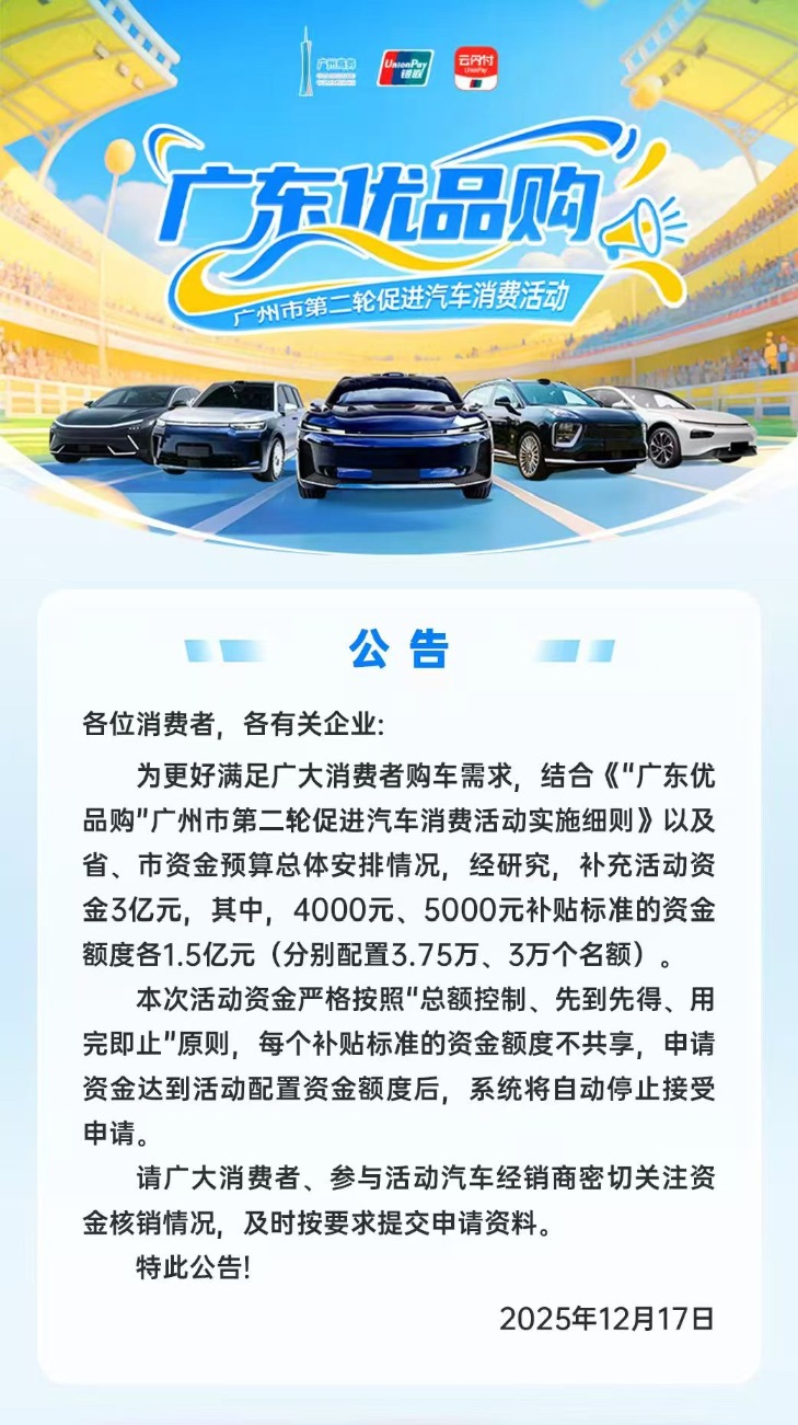 12月17日,据广州市商务局,“广东优品购”广州市第二轮促进汽车消费活动补充活动资金达3亿元。