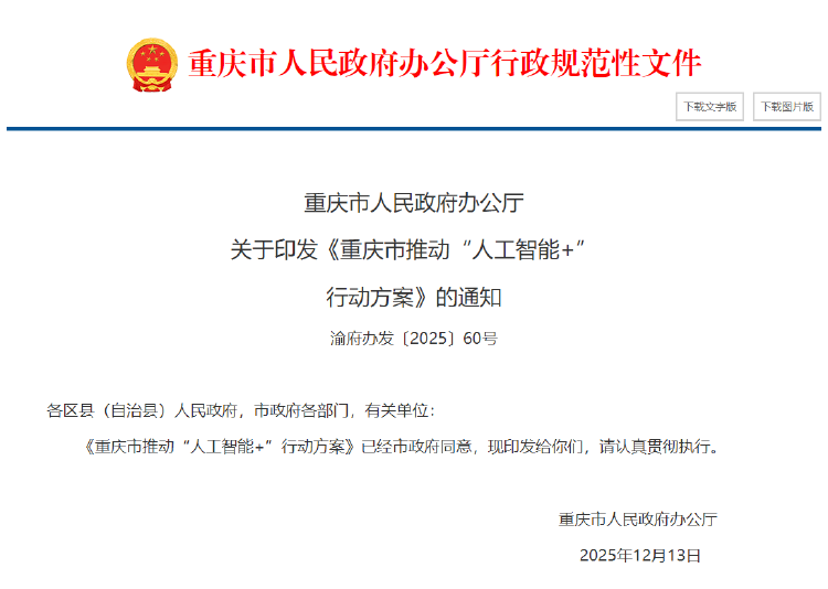 为贯彻落实《国务院关于深入实施“人工智能+”行动的意见》(国发〔2025〕11号),推动人工智能(AI)和数字重庆双向赋能,加快建设全国人工智能应用高地,近日,重庆发布了《重庆市推动“人工智能+”行动方案》(以下简称《方案》)。