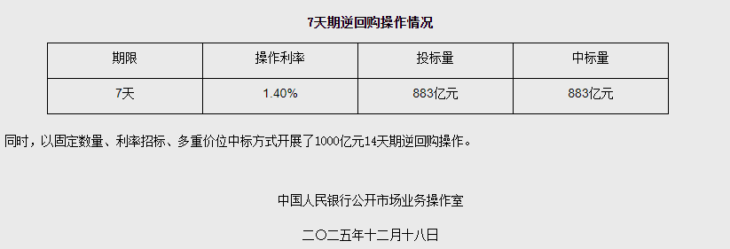 中新网12月18日电据央行网站消息,2025年12月18日,中国人民银行以固定利率、数量招标方式开展了883亿元7天期逆回购操作。