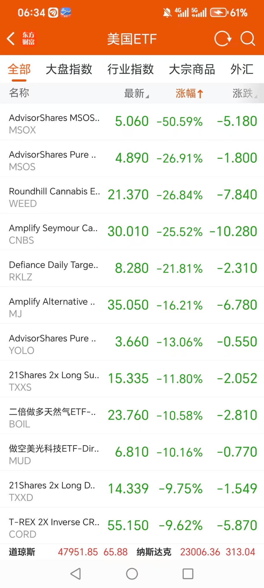 ADVISORSHARES PURE US CANNABIS ETF(MSOS.US) 跌 26.76%,成交额 5.07 亿美元