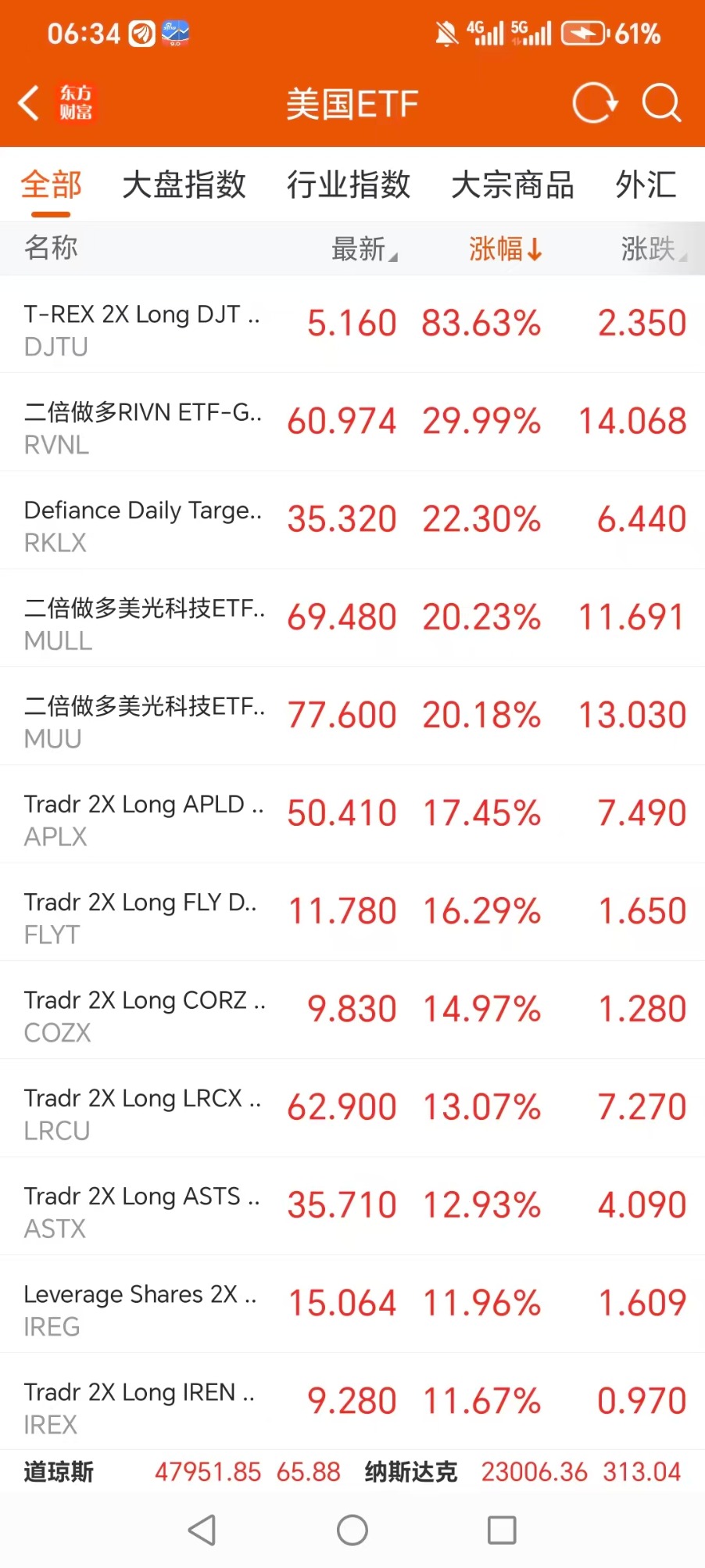 2倍做多DJT ETF-T-REX(DJTU.US) 升 83.27%,成交额 5448.36 万美元。