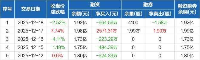 宁波精达融资融券信息显示,2025年12月18日融资净偿还664.59万元;融资余额1.92亿元,较前一日下降3.35%。