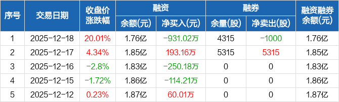 融资方面,当日融资买入1689.45万元,融资偿还2620.47万元,融资净偿还931.02万元。融券方面,融券卖出0股,融券偿还1000股,融券余量4315股,融券余额11.08万元。融资融券余额合计1.76亿元。