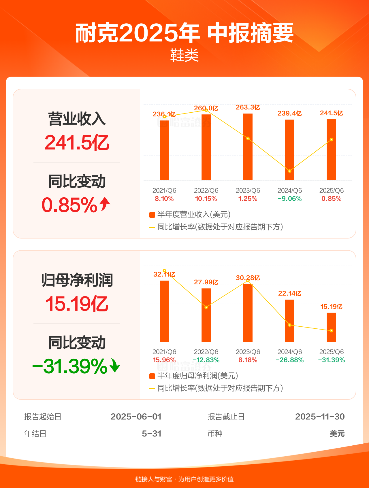 耐克12月18日发布中期业绩,截至2025年11月30日的6个月内,该公司营业收入241.47亿元,同比增长0.85%;公司权益持有人应占溢利(归母净利润)15.19亿元,同比减少31.39%。