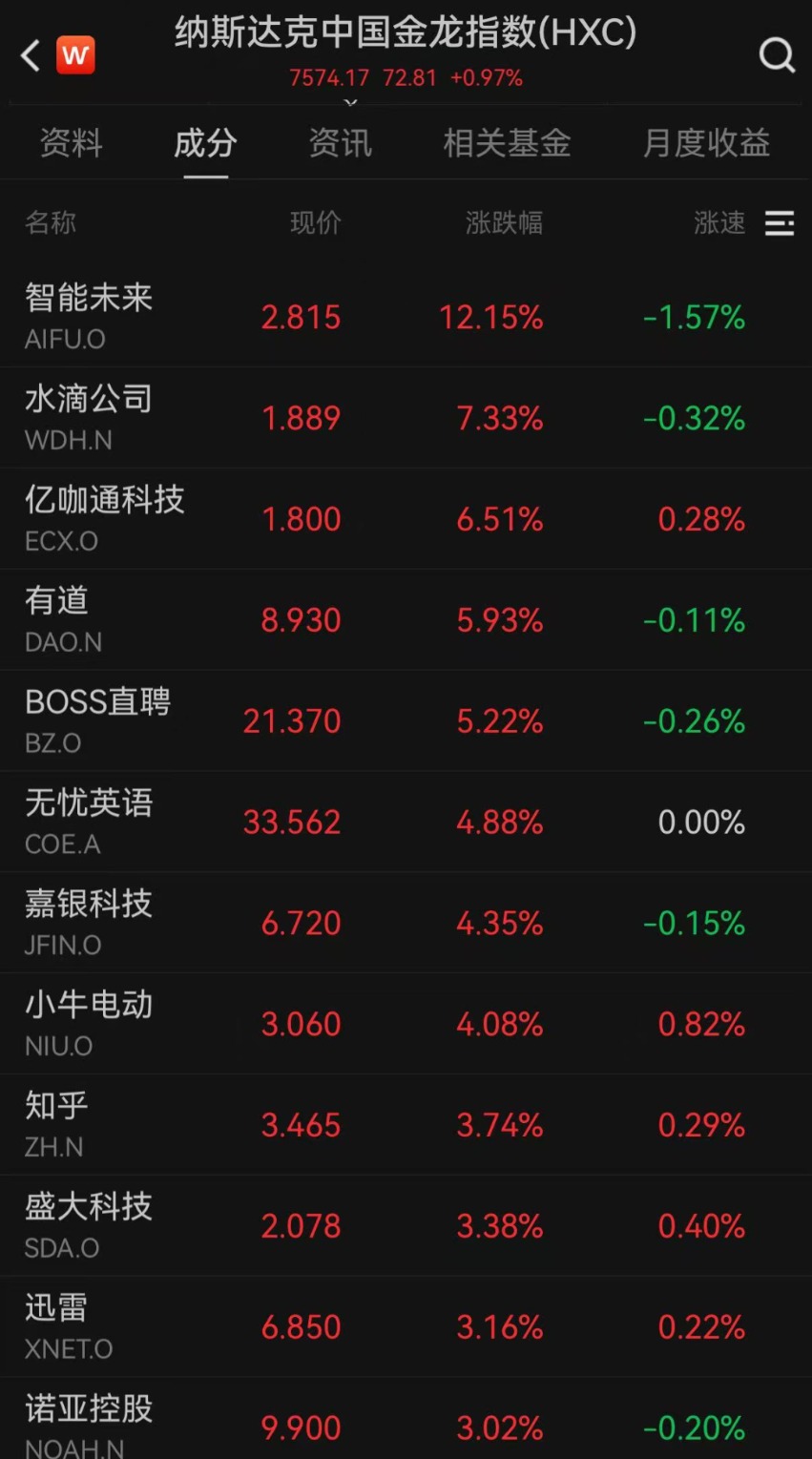 纳斯达克中国金龙指数涨0.97%。热门中概股涨跌互现,有道涨近6%、小牛电动涨超4%、小鹏汽车涨超2%,叮咚买菜跌超7%。