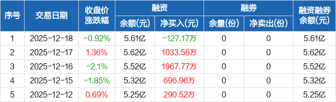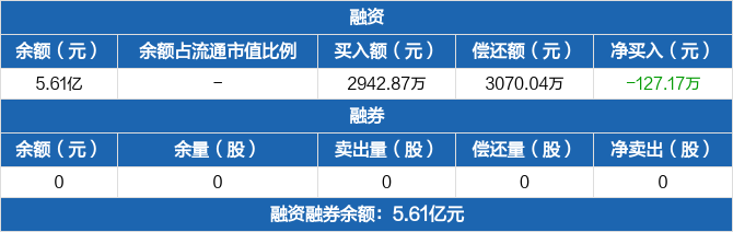 融资方面,当日融资买入2942.87万元,融资偿还3070.04万元,融资净偿还127.17万元。融券方面,融券卖出0份,融券偿还0份,融券余量0份,融券余额0元。融资融券余额合计5.61亿元。