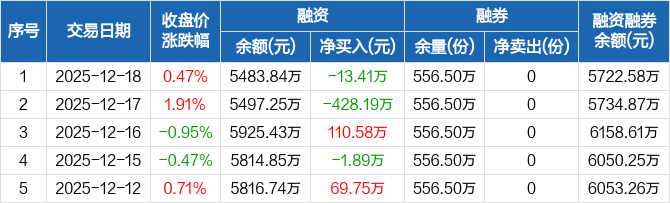 融资方面,当日融资买入318.2万元,融资偿还331.61万元,融资净偿还13.41万元。融券方面,融券卖出0份,融券偿还0份,融券余量556.5万份,融券余额238.74万元。融资融券余额合计5722.58万元。