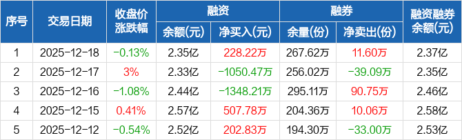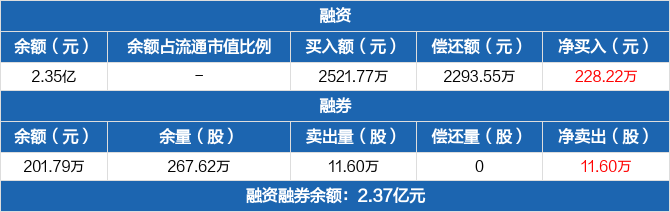 融资方面,当日融资买入2521.77万元,融资偿还2293.55万元,融资净买入228.22万元。融券方面,融券卖出11.6万份,融券偿还0份,融券余量267.62万份,融券余额201.79万元。融资融券余额合计2.37亿元。