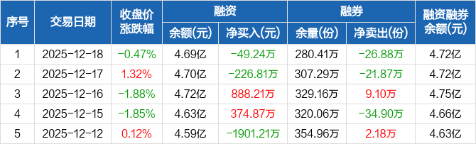 融资方面,当日融资买入1682.23万元,融资偿还1731.47万元,融资净偿还49.24万元。融券方面,融券卖出5.6万份,融券偿还32.48万份,融券余量280.41万份,融券余额236.11万元。融资融券余额合计4.72亿元。