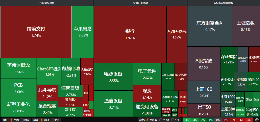 昨日三大指数走势分化,沪指涨0.16%,深证成指跌1.29%,创业板指跌2.17%。沪深两市成交额超过1.6万亿。行业板块涨多跌少,医药商业、航天航空、商业百货、银行、医疗服务板块涨幅居前,电池、电源设备、电子化学品、能源金属板块跌幅居前。