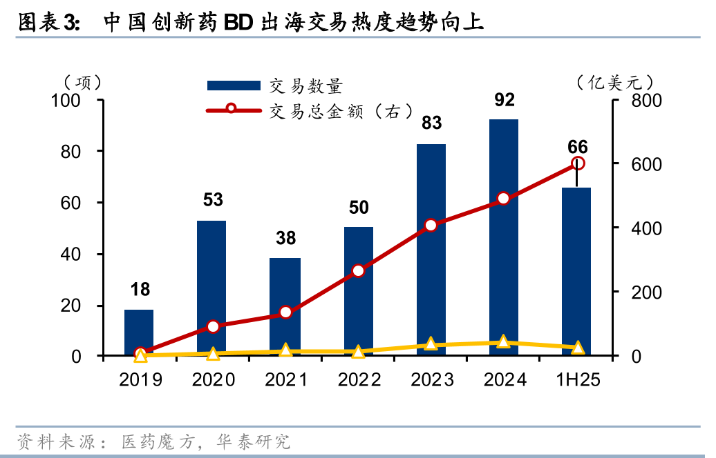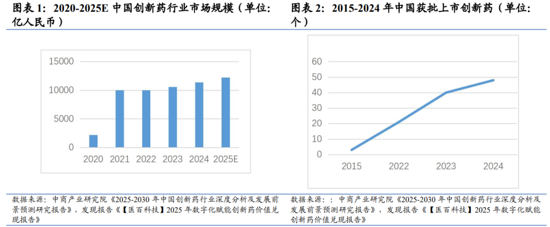 近年来创新药产业规模持续扩大,从2020年约8198亿元增至2024年1.14万亿元,年均复合增长率达8.53%,预计2025年将达1.22万亿元。受益于药监改革、医保支持等政策红利,我国获批创新药数量自2015年的3个大幅增长至2024年的48个,2025年医保目录新增50种一类创新药,正加速从“仿制药大国”向“创新药强国”迈进。