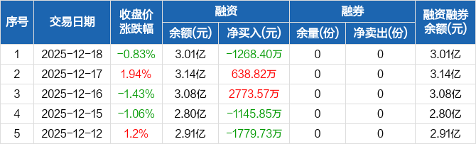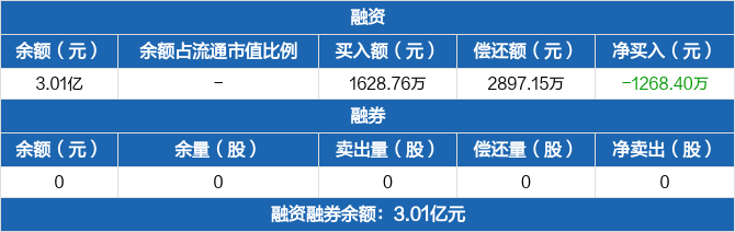 融资方面,当日融资买入1628.76万元,融资偿还2897.15万元,融资净偿还1268.4万元。融券方面,融券卖出0份,融券偿还0份,融券余量0份,融券余额0元。融资融券余额合计3.01亿元。