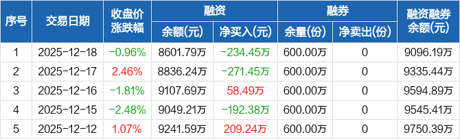 融资方面,当日融资买入456.24万元,融资偿还690.69万元,融资净偿还234.45万元。融券方面,融券卖出0份,融券偿还0份,融券余量600万份,融券余额494.4万元。融资融券余额合计9096.19万元。