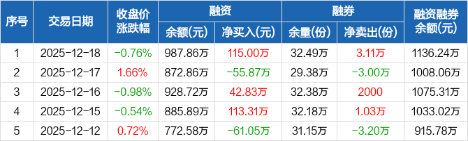 沪深300ETF南方:融资净买入115万元,融资余额987.86万元(12-18)