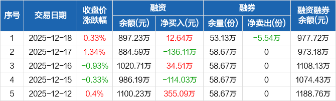融资方面,当日融资买入154.3万元,融资偿还141.66万元,融资净买入12.64万元。融券方面,融券卖出0份,融券偿还5.54万份,融券余量53.13万份,融券余额80.49万元。融资融券余额合计977.72万元。