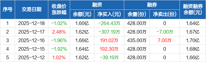 融资方面,当日融资买入670.53万元,融资偿还934.97万元,融资净偿还264.43万元。融券方面,融券卖出0份,融券偿还0份,融券余量428万份,融券余额455.82万元。融资融券余额合计1.64亿元。