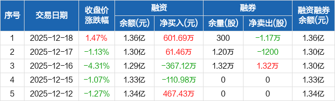 融资方面,当日融资买入1225.53万元,融资偿还623.84万元,融资净买入601.69万元。融券方面,融券卖出0股,融券偿还1.17万股,融券余量300股,融券余额6414元。融资融券余额合计1.36亿元。