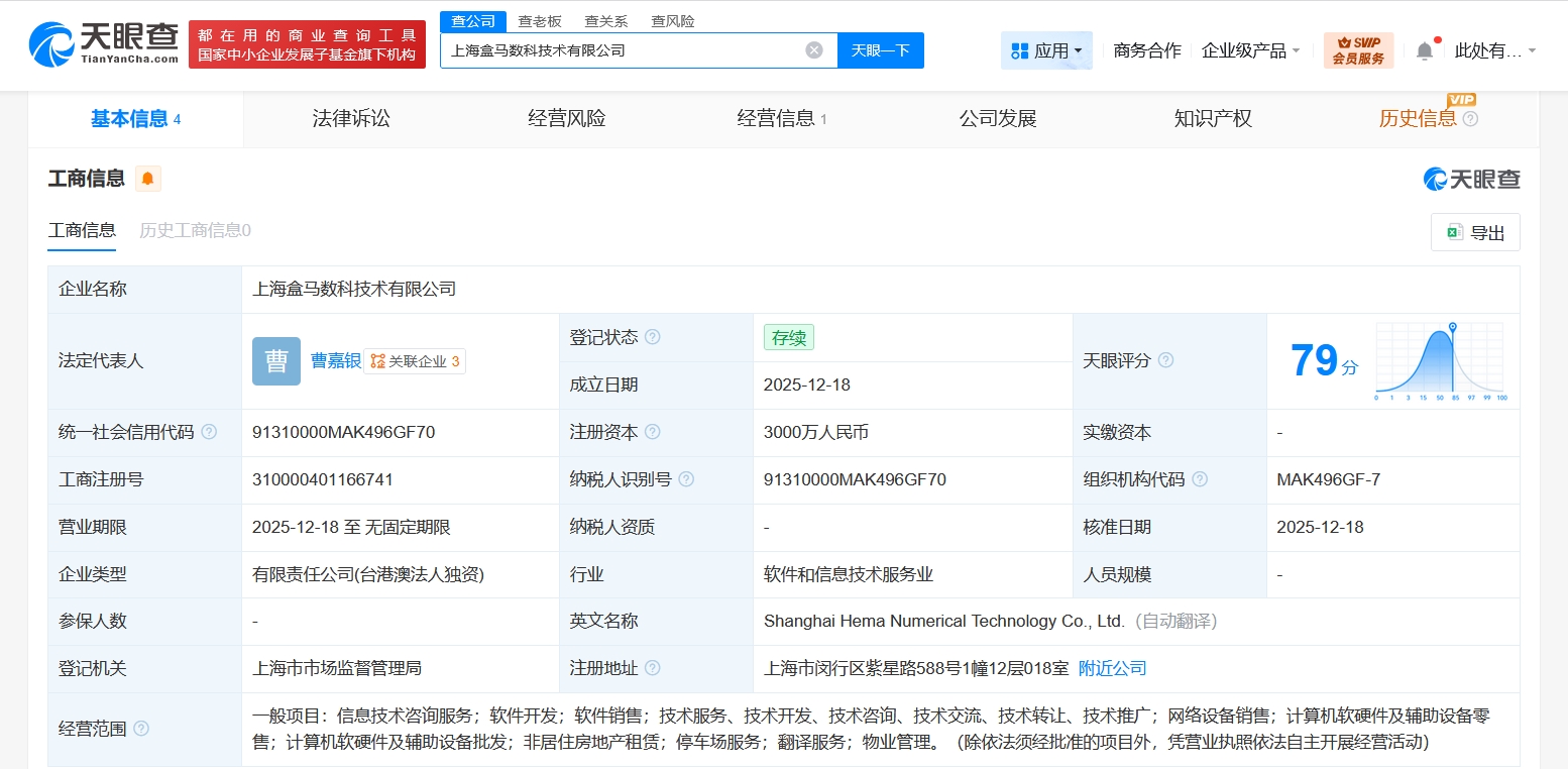 每经AI快讯,天眼查App显示,近日,上海盒马数科技术有限公司成立,法定代表人为曹嘉银,注册资本3000万元人民币,经营范围含信息技术咨询服务、软件开发、软件销售、网络设备销售、计算机软硬件及辅助设备零售、计算机软硬件及辅助设备批发、非居住房地产租赁等,由盒马(中国)有限公司全资持股。