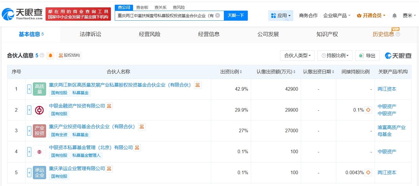 每经AI快讯,天眼查App显示,近日,重庆两江中瀛扶摇壹号私募股权投资基金合伙企业(有限合伙)成立,执行事务合伙人为重庆承运企业管理有限公司、中银资本私募基金管理(北京)有限公司,出资额10亿元人民币,经营范围为以私募基金从事股权投资,由重庆两江新区高质量发展产业私募股权投资基金合伙企业(有限合伙)、中银金融资产投资有限公司、中银资本私募基金管理(北京)有限公司等共同出资。