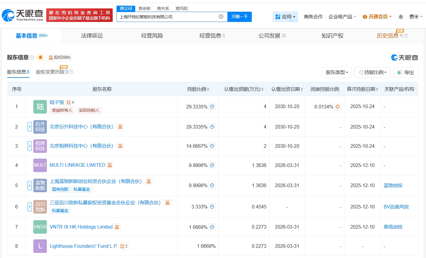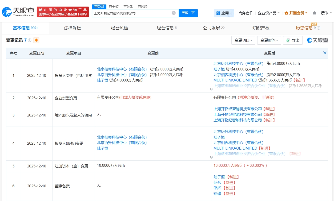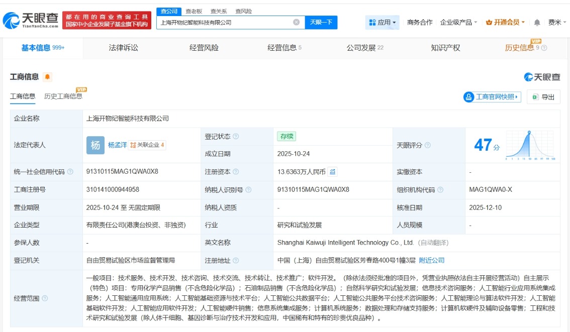 每经AI快讯,天眼查App显示,近日,上海开物纪智能科技有限公司发生工商变更,新增百度旗下三亚百川致新私募股权投资基金合伙企业(有限合伙)、上海蓝驰新皓创业投资合伙企业(有限合伙)等为股东,注册资本由10万元人民币增至约13.6万元人民币,同时,多位高管发生变更。该公司成立于今年10月,法定代表人为杨孟洋,经营范围包括人工智能行业应用系统集成服务、人工智能通用应用系统、人工智能基础资源与技术平台等,现由陆子恒、北京衍升科技中心(有限合伙)及上述新增股东等共同持股。公开资料显示,该公司是一家人工智能技术驱动材料研发商。