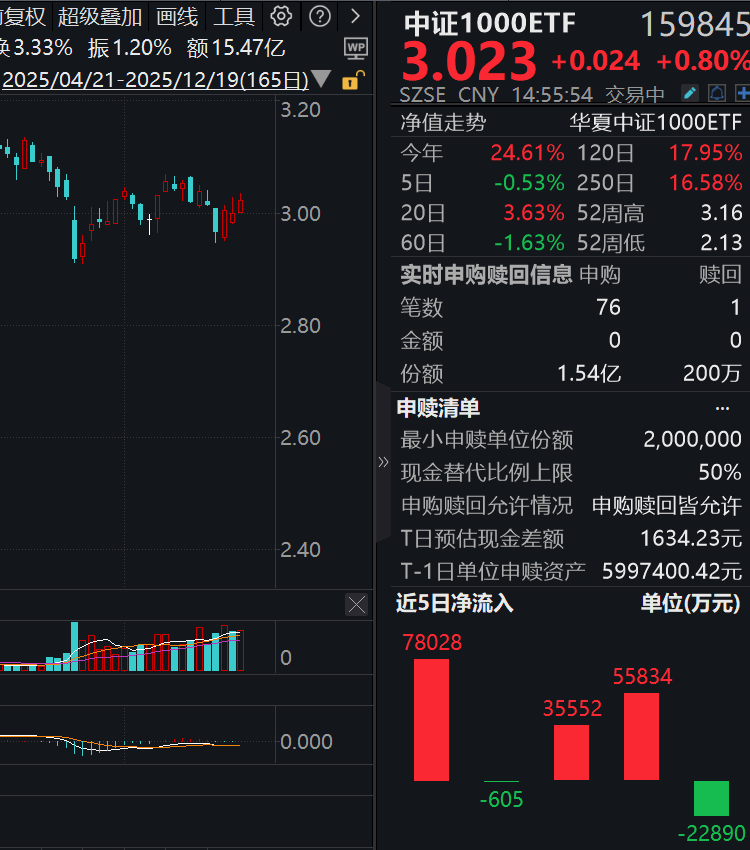 12月19日,A股三大指数集体上涨,其中沪指上涨0.4%。截至14:55,中证1000ETF(159845)上涨0.8%。其他宽基指数中,上证50涨0.22%,沪深300涨0.39%,中证500涨0.96%。
