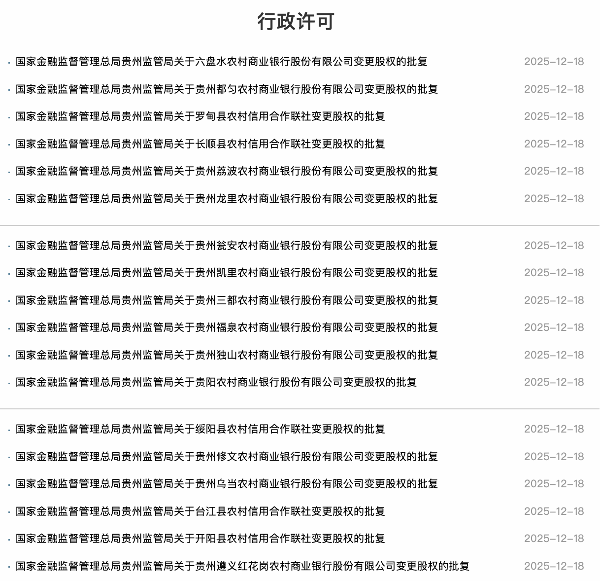 日前,国家金融监督管理总局贵州监管局一连公布多条关于股权变更的批复。批复显示,国家金融监督管理总局贵州监管局同意贵州农村商业联合银行股份有限公司受让16家农村商业银行的股份以及5家农村信用合作联社的股份。