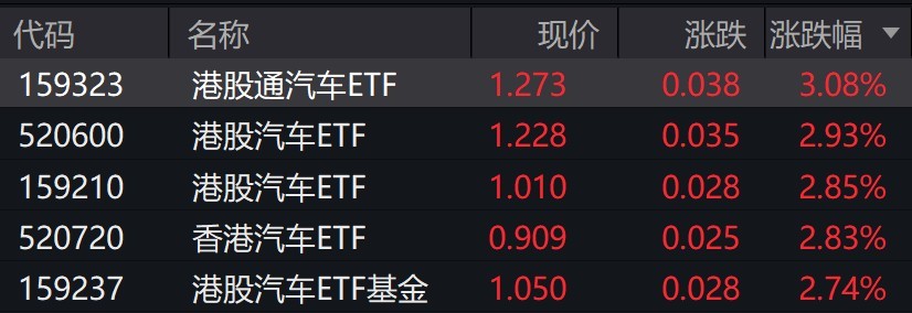 受盘面影响,港股汽车相关ETF涨约3%。