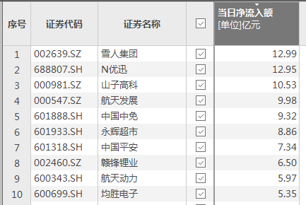 上证报中国证券网讯(记者李雨琪)Choice数据显示,12月19日,资金净流入额排名前十的个股依次是雪人集团、N优迅、山子高科、航天发展、中国中免、永辉超市、中国平安、赣锋锂业、航天动力、均胜电子。其中,优迅股份上市首日获净流入12.95亿元。