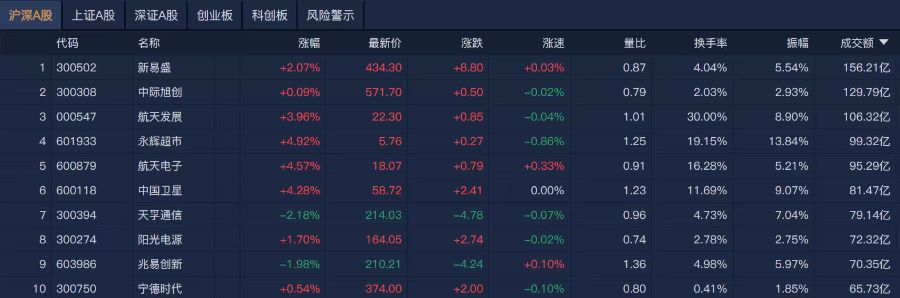 个股方面,新易盛、中际旭创、航天发展成交额破百亿元。