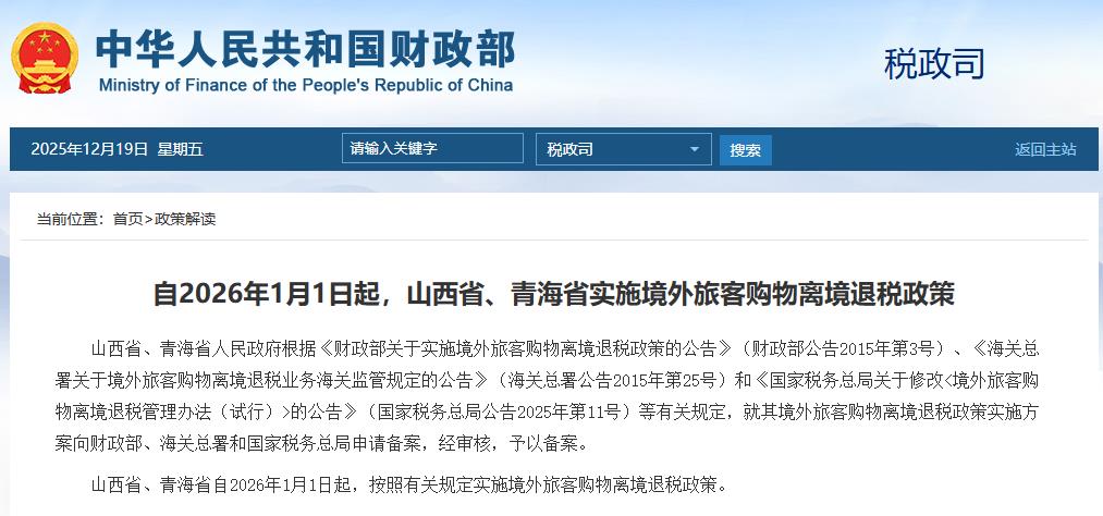 自2026年1月1日起 山西省、青海省实施境外旅客购物离境退税政策