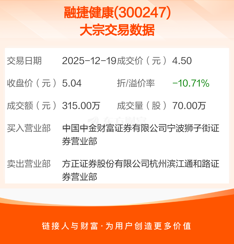 2025年12月19日,融捷健康发生1笔大宗交易,共成交70.00万股,成交金额315.00万元,占其流通市值比例为0.08%