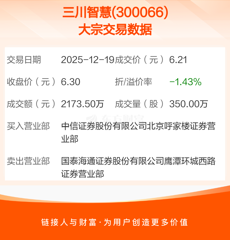 大宗交易:三川智慧成交2173.50万元,折价1.43%(12-19)