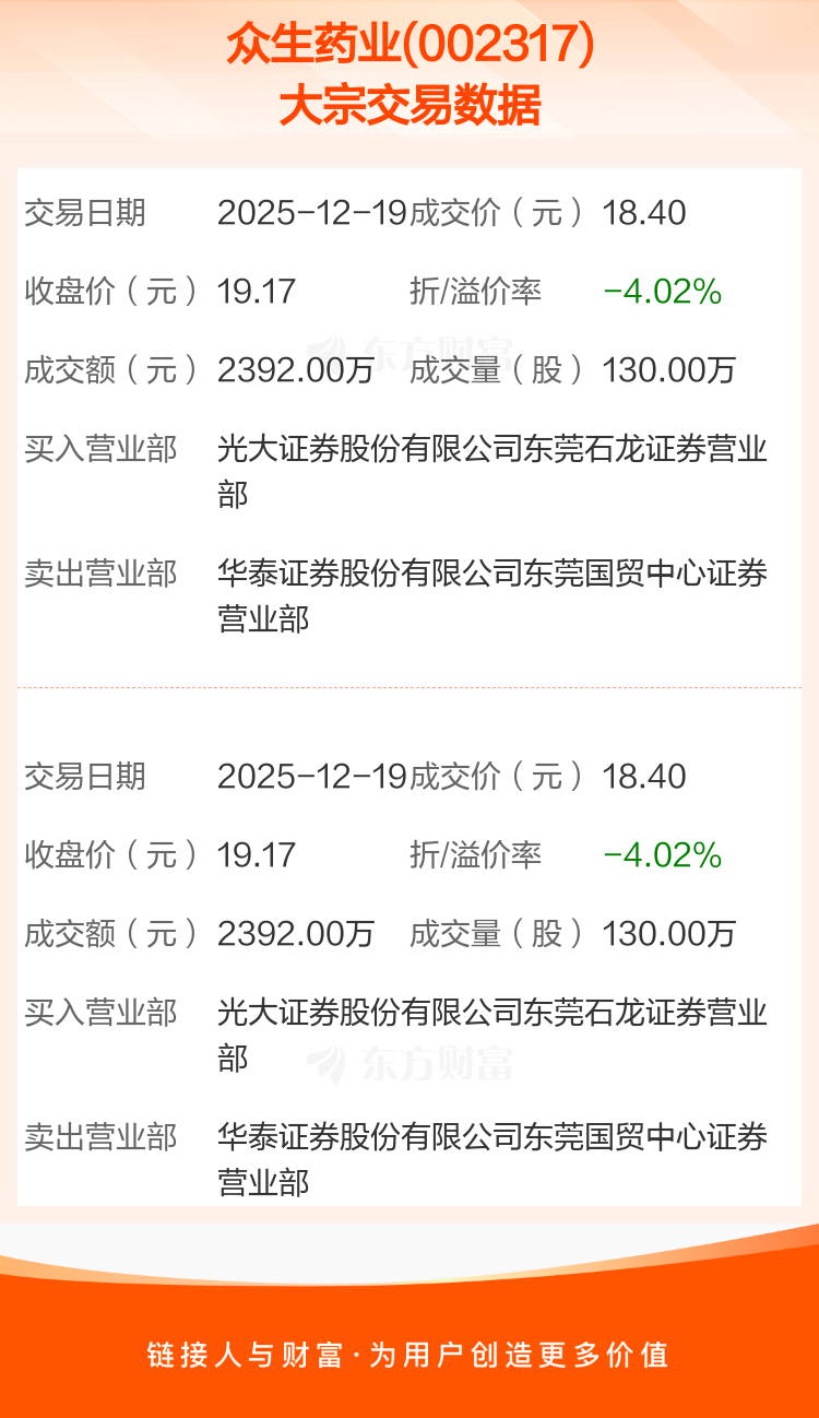 大宗交易:众生药业成交4784.00万元,折价4.02%(12-19)