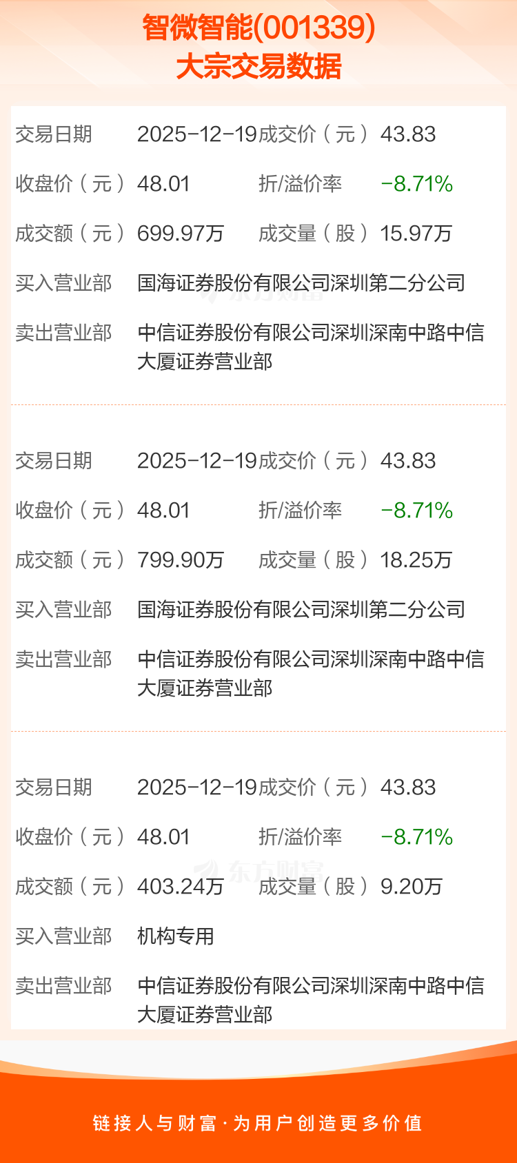 2025年12月19日,智微智能发生3笔大宗交易,共成交43.42万股,成交金额1903.11万元,占其流通市值比例为0.33%。