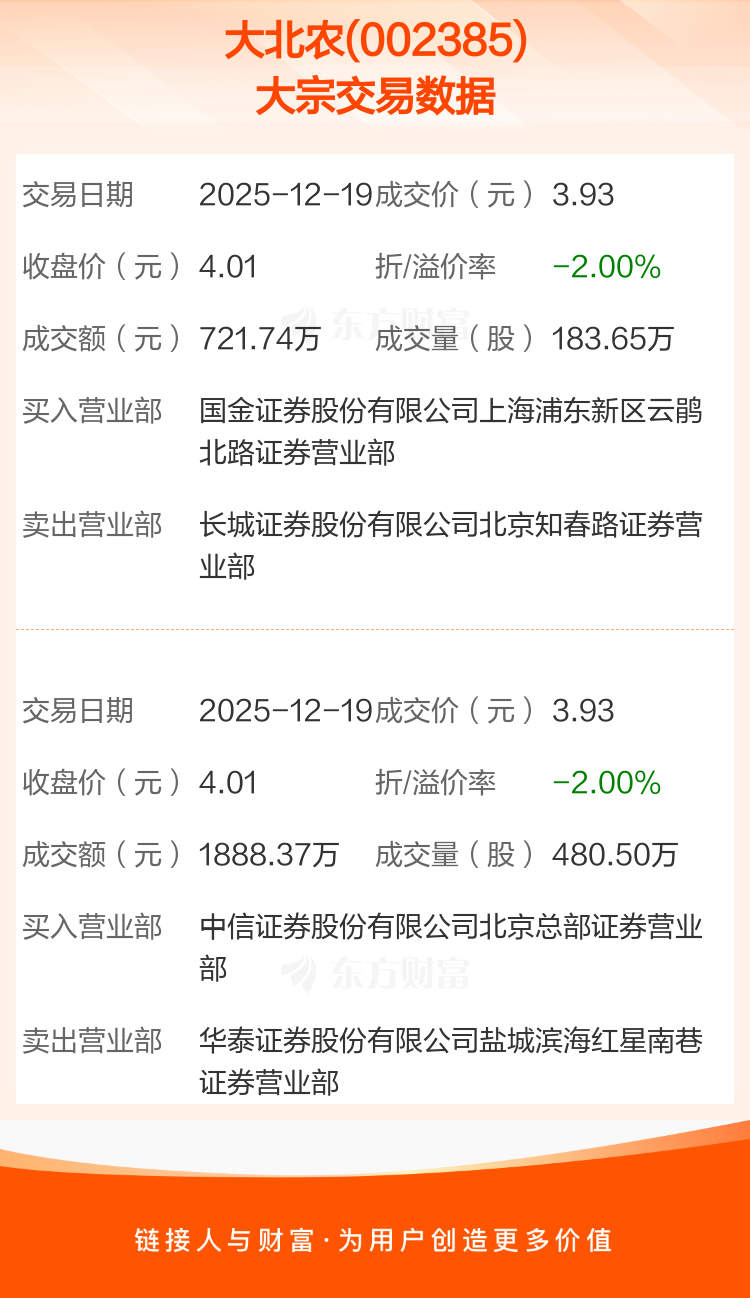 2025年12月19日,大北农发生2笔大宗交易,共成交664.15万股,成交金额2610.11万元,占其流通市值比例为0.18%。
