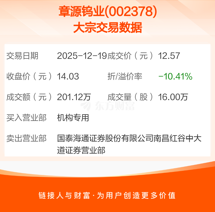 2025年12月19日,章源钨业发生1笔大宗交易,共成交16.00万股,成交金额201.12万元,占其流通市值比例为0.01%