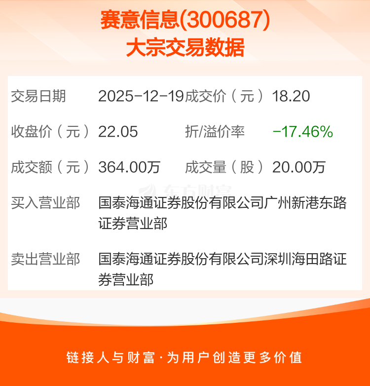 2025年12月19日,赛意信息发生1笔大宗交易,共成交20.00万股,成交金额364.00万元,占其流通市值比例为0.05%