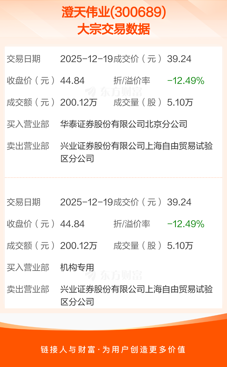 2025年12月19日,澄天伟业发生2笔大宗交易,共成交10.20万股,成交金额400.24万元,占其流通市值比例为0.09%。