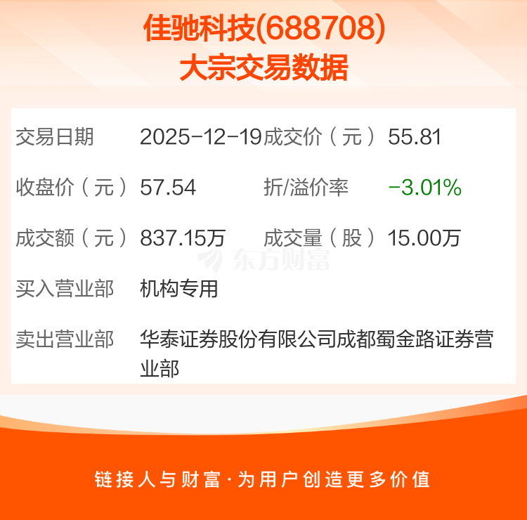 大宗交易:佳驰科技成交837.15万元,折价3.01%(12-19)