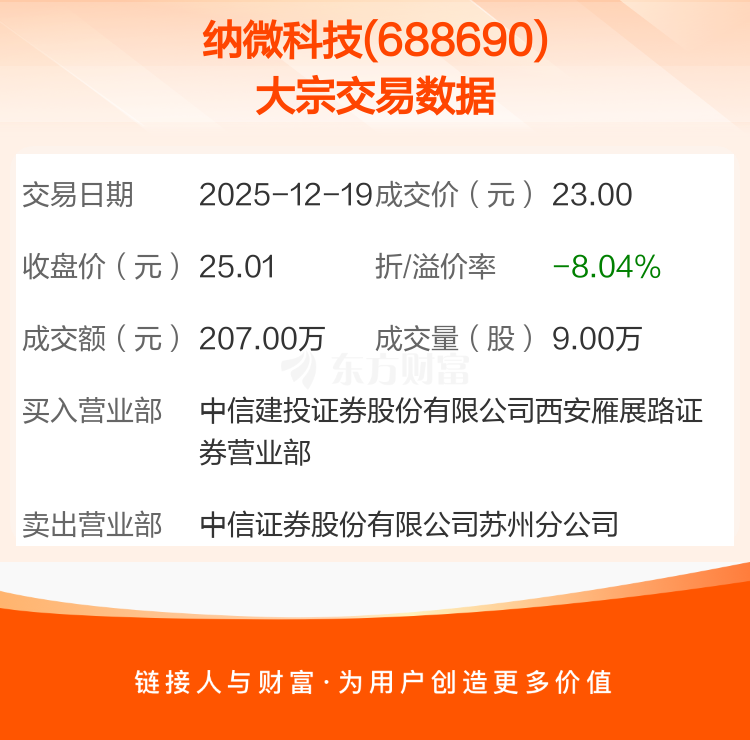 大宗交易:纳微科技成交207.00万元,折价8.04%(12-19)