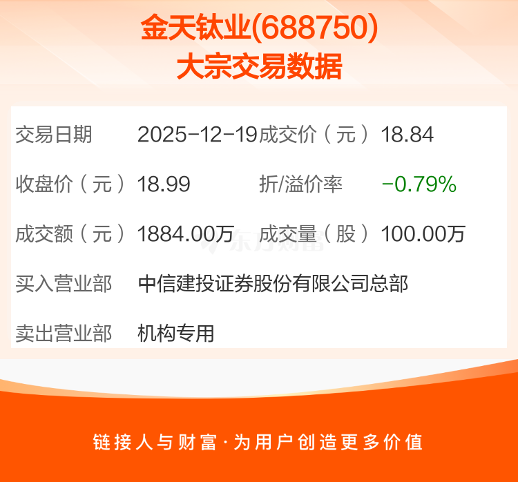 大宗交易:金天钛业成交1884.00万元,折价0.79%(12-19)
