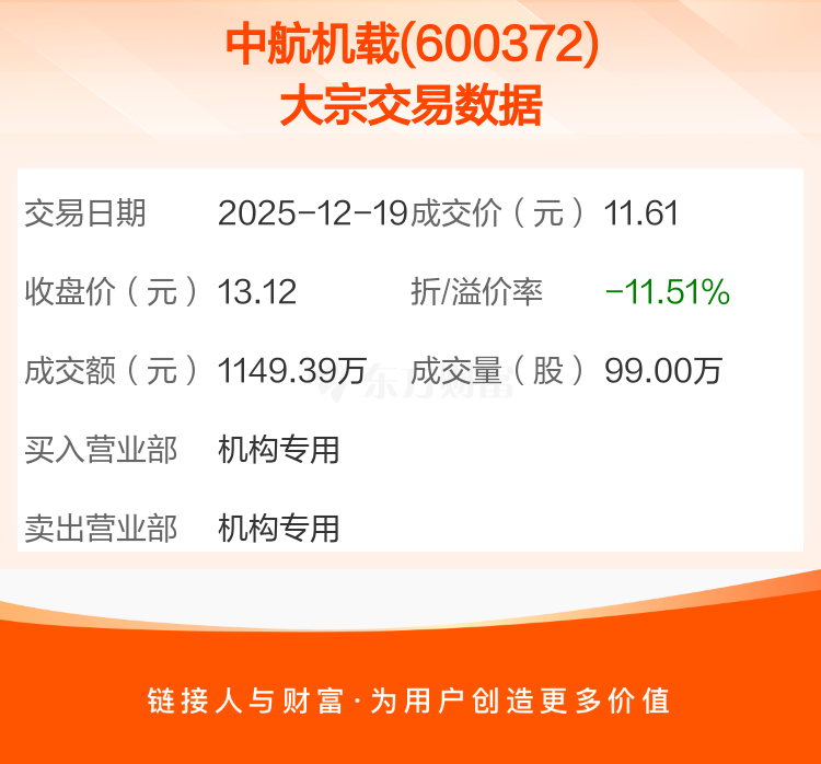 2025年12月19日,中航机载发生1笔大宗交易,共成交99.00万股,成交金额1149.39万元,占其流通市值比例为0.02%。