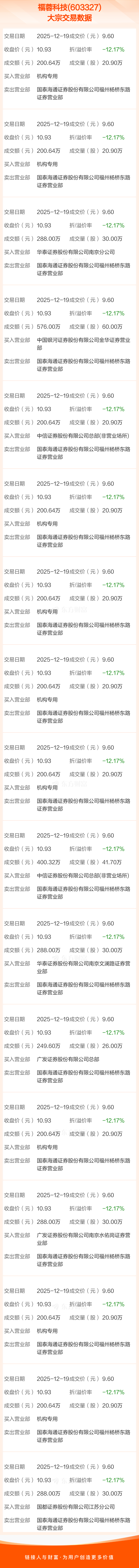 2025年12月19日,福蓉科技发生17笔大宗交易,共成交456.70万股,成交金额4384.32万元,占其流通市值比例为0.40%。