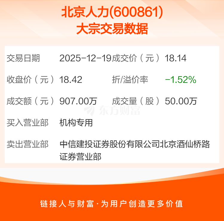 2025年12月19日,北京人力发生1笔大宗交易,共成交50.00万股,成交金额907.00万元,占其流通市值比例为0.13%。