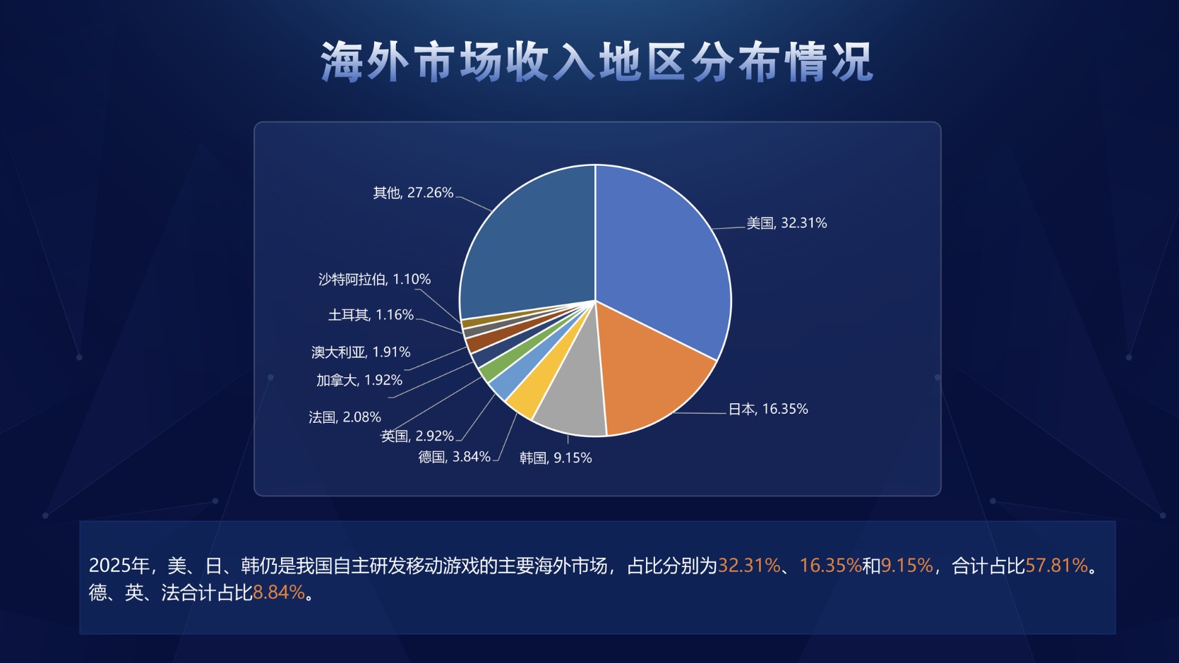 美、日、韩仍是我国移动游戏的主要海外市场,占比分别为32.31%、16.35%和9.15%,三者合计占比57.8%。紧随其后的德、英、法三个市场合计占比约为8.8%。无论是成熟市场还是拉美、中东等新兴市场,整体分布格局无明显变化。