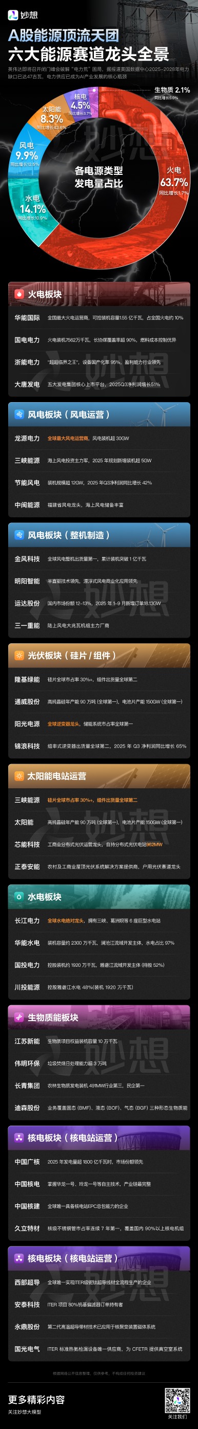 当下,电力俨然成为了制约AI算力的瓶颈,中国当前的能源结构如何?各类能源的支柱又分别是哪些公司?妙想为你一图梳理。