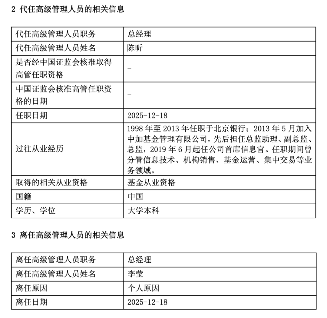 12月19日,中加基金发布高级管理人员变更公告。总经理李莹因个人原因离职,公司首席信息官陈昕代任总经理。