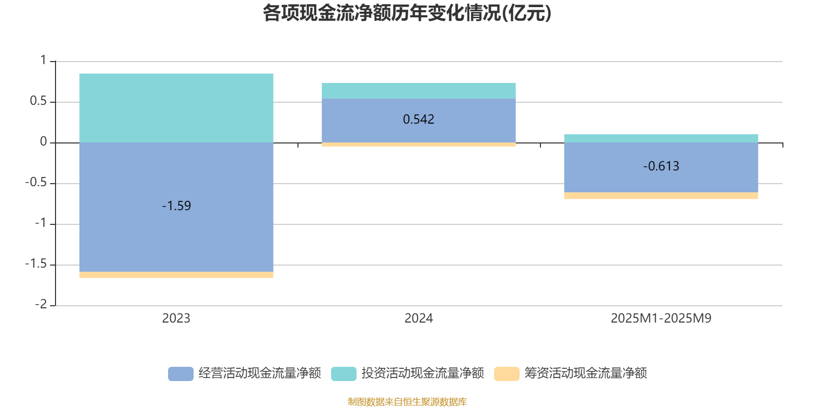 2025年1月至9月,公司经营活动现金流净额为-6126.4万元,同比减少1.21亿元;筹资活动现金流净额-816.2万元,同比减少318.7万元;投资活动现金流净额1005.8万元,上年同期为1242.4万元。