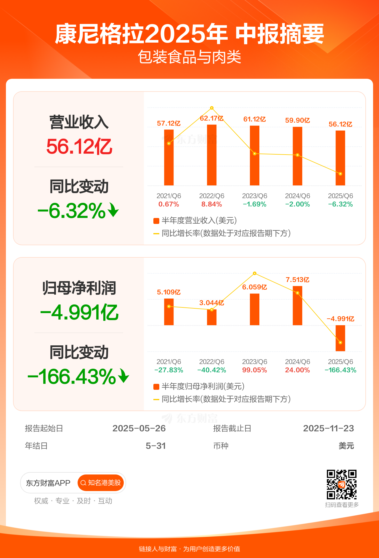 康尼格拉12月19日发布中期业绩,截至2025年11月23日的6个月内,该公司营业收入56.12亿美元,同比减少6.32%;公司权益持有人应占溢利(归母净利润)-4.99亿美元,上年同期7.51亿美元。